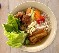 Grilled pork served with rice noodles and fresh herbs.