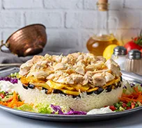 A traditional Saudi dish that brings together meat, usually lamb or beef, with a blend of aromatic spices and rice. The result is a flavourful and hearty one-pot meal where the spices infuse the rice with rich, savoury notes, while the meat is tender and succulent. The layers of meat and rice are carefully arranged and then flipped upside down before serving, creating a visually stunning presentation.