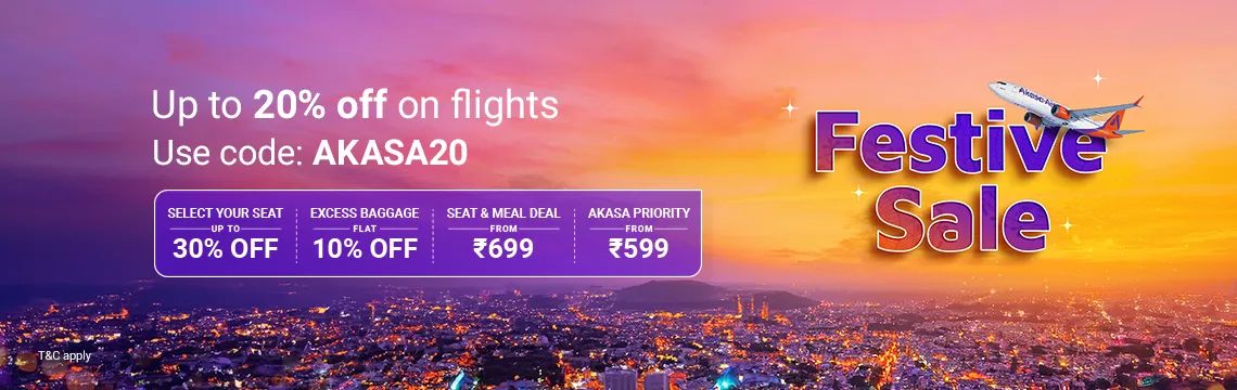 Introducing our Festive Sale. Enjoy up to 20% off on flights and a bunch of discounts on our Add-Ons services. Use code: AKASA20. Book your vacation today.