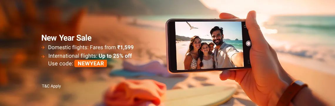 Our New Year Sale is on. Enjoy fares starting at ₹1,599 on domestic flights and get up to 25% off with code: NEWYEAR on international flights.